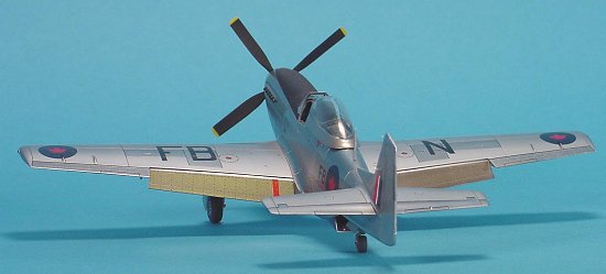 Prior to joining the upper and lower surfaces of the wing, the bomb pylon attachment points were drilled out and the main gear bay was painted. It is infinitely easier to paint the landing gear bay at this point, because of the variety of colours required. The main spar that runs along the back of the gear bay was finished in Chromate Yellow, the main spar which separates the 2 wheel wells was painted Interior Green and the remainder of the wheel well was finished in Testors Metalizer Non-Buffing Aluminum. Some dark washes and various dry-brushings popped out the details and added depth and life to this area. With the wing assembly completed, both it and the tail planes were installed. It was starting to look like a Mustang now, and still no need for filler.