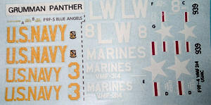 Assembly is covered in 10 well illustrated steps and the decals placement is covered with four drawings. There are two decal options with this boxing and both are in overall Glossy Sea Blue. One is a post-war Marine Panther of VMF-314 stationed at Cherry Point circa 1954. There is no unit insignia, just the white unit codes. The second option is for No 3 of the blue Angles with their normal yellow trim. The decals still look good after all these years.