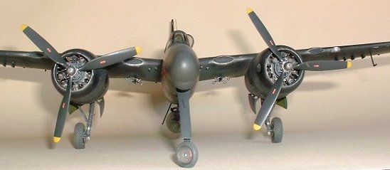 The Engine crankcases were painted a dark medium gray and dry-brushed with contrasting lighter shades of gray and the cylinders were painted flat black first, then drybrushed with SNJ powder with the push rods glossy black and the harness was a brown/ gray and brown tone wiring was added to each engine and the hubs on the “wrong Props” was painted with Testors MM metalizer and polished out/.