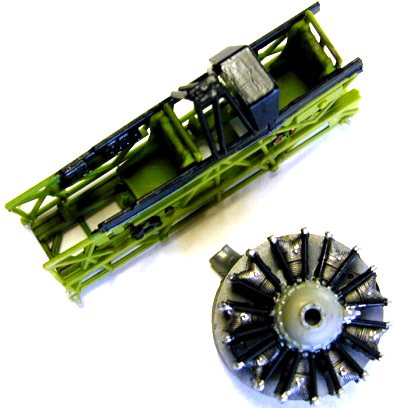 Next, I assembled the engine, painting it Pactra steel, then dry brushing the cylinders with Testors aluminum. The pushrods were hand painted with Humbrol chrome silver, while the front engine cover was painted with Pactra rebel gray.