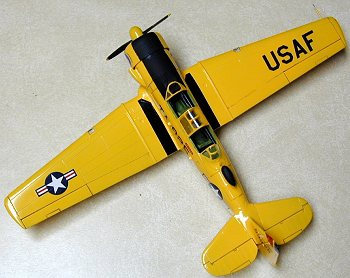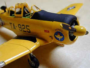 While the chromate yellow dried, I painted various other parts (wheels, propeller, and dorsal antenna housing) flat black. The landing gear and wheel hubs were sprayed with Model Masters non-buffing aluminum. (Note: the kit instructions say to paint the landing gear the body color. I was able to find pictures of T-6s with their gear painted both ways, but the ones that had body-colored landing gear were restored aircraft, so I just felt they would look more authentic painted aluminum.)