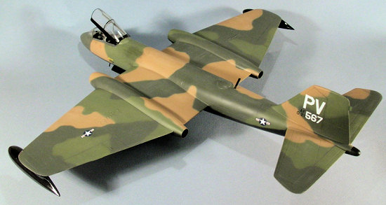 Except for the Battle of the Canopy, I enjoyed building my B-57B. It really stands out in my display case, with it’s bat-like shape and acres of tan, green, and black paint. A previous excursion into Classic Airframes World (their Meteor F.8) involved a lot of profanity, putty, carving, profanity, beer, and profanity. Not so with this one. It’s like adding resin details to one of Monogram’s better jet kits from the 1980s. I’m having more fit issues and using a lot more putty on the Hasegawa P-38F I’m currently building. Classic Airframes has never intended its kits to be for beginners, but their B-57B is definitely one that someone with a little experience adding resin aftermarket details to models would have a good time building. Highly recommended, but if you think you might want one, get it now. They have been selling fast.