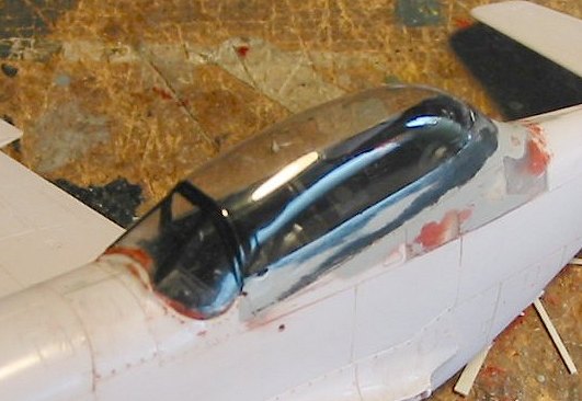 Probably the hardest part of all was cutting the Falcon canopy to fit to the fuselage, since I only had the one and had to proceed conservatively to avoid a mistake. I had decided to do the model with the canopy closed since the three TF-51Ds out at Chino look better with their canopies closed than when they have they are slid open. Before finally fitting the canopy in position, I polished the model so I could apply an overall aluminum paint job.
