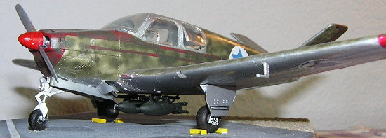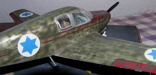 Adding the bomb shackles and bombs – reportedly the Israeli’s used old ones found in a RAF dump, so I did the same. A quick trip to the spares “dump” box and I scrounged a pair of shackles from a 1/48 Tamiya Mossy and pair of 200 lb bombs from a Hasegawa Spitfire. Now I was ready to put the “bomb” in the Bonanza bomber. I used a couple of photos from books and from the internet for positioning the pair of bomb shackles on the fuselage. Alex Yofe’s web site (www.wings48.com) is the place to go for information on piston aircraft from the early years in the IAF. He has a lot of photos and artwork on various IAF and Arab aircraft as well as a nice chat forum.