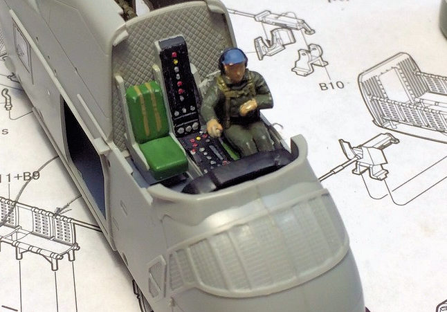 The great thing about building a helicopter is that it generally goes quickly-- build the fuselage, and you're nearly finished! So it is no surprise to say that construction starts with the cockpit and then the interior of the cabin. The cockpit went together well enough, with a decal for the instrument panel. It is adequate for the job, as you can't see the panel that well anyways. The cockpit was painted light gray and black, with a medium green seat cushions on the empty seat. (I basically copied the colors used in a build review of the 1/48 kit on the IPMS USA website.)