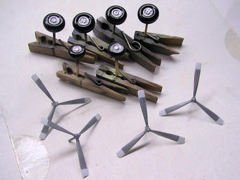 piece of plastic card to each tip to form the 3-bladed right hand propellers.