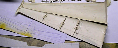 11) There are 8 servo pods, which operate the flaps and ailerons. Some aircraft had only 5, which are closer to the fuselage. I fitted all the eight pods of different size the larger ones are nearer to the fuselage trailing edge. Their place was also relocated from the position they were printed in the surface after checking with scale plans. Air intake at the rear and other surface detail items were added to the kit.