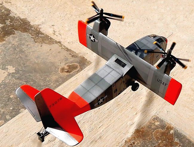 The kit features recessed panel detail, and has several working parts which was an important feature in those early days of Aurora kits. These included two sets of contra rotating propellers, tilting wings at different angles, rotating wheels and a nose wheel that swivels. The instructions has five stages of sub-assembly: the engines, undercarriage, fuselage, wings and final erection of all the sub assemblies. The kit has 45 parts and 9 clear parts.