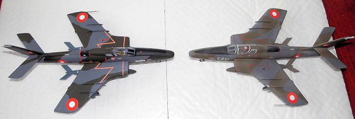 In the first year of operation the Thunderflash flew unpainted but often with colorful bands on the tail. In 1958 the aircraft got camouflaged; most likely using colors that was on stock from earlier aircraft. The sides / upper surfaces were painted Sea Grey / Dark Green while all under surfaces were almost certain PRU Blue.