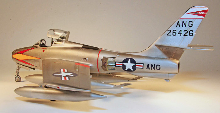 After several days of drying for the decals the entire model was airbrushed with a coat of 50/50 Dullcote and Glosscote for a satin/semi-matt finish followed by an application of Tamiya Black Panel Line wash to the control surface engraved lines. The small parts including the landing gear doors, canopy, wheels, and pylons and fuel tanks were attached. The pylons fit well to the undersurface of the wings provided some care is exercised in trimming the pylon at the join surface to match the wing surface contour and remove the small section of the raised panel lines on the wing crossing the pylon. The unique canopy lift mechanism of the Thunderstreak requires careful assembly of the supports to the canopy to allow alignment with the opening in the fuselage. I used Zap a Gap Medium for assembly and Testors clear parts cement to attach the windscreen.