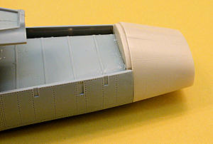 I used AMS Resin’s fuel tank extension plugs, but was disappointed because the resin had shrunk when curing and the pieces were smaller than the surrounding fuel tank halves, which were sawed in half to accommodate the plugs. I bulked up the resin pieces with additional layers of CA glue and blended them in with very labor-intensive heavy sanding. If I were to do it over again, I would cut a couple of sections out of the extra fuel tank provided in the kit and use them instead of the undersized resin.
