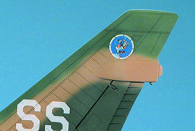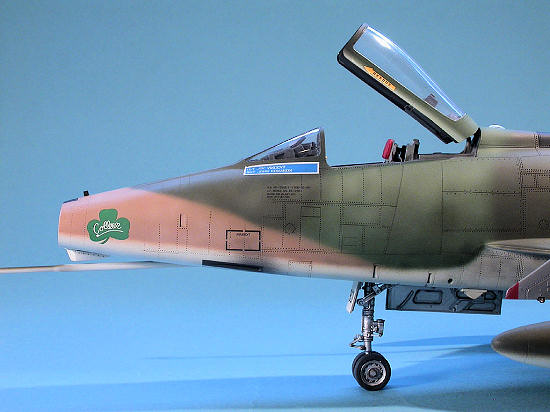 Future Floor polish was used as a gloss coat. The decals came from Cutting Edge sheet 32090, entitled “F-100D Hun #4”. Lt. Joe Vincent’s “Colleen”, F-100D-51-NH serial number 52-2901 of the 309th Tactical Fighter Squadron, 31st Tactical Fighter Wing as based at Tuy Hoa AFB in 1970 was the airplane chosen. The decals went on without incident, although I did slightly tear one of the large “SS” markings on the tail and had to repair that with flat white paint. I also had small tears in a couple of the white sections of the national insignia. One of the great things about the F-100s in Vietnam is that the field-applied camouflage painting wiped out just about every stencil, so I didn’t have to worry about applying those evil little markings which always manage to silver on me, no matter how good the gloss coat underneath.