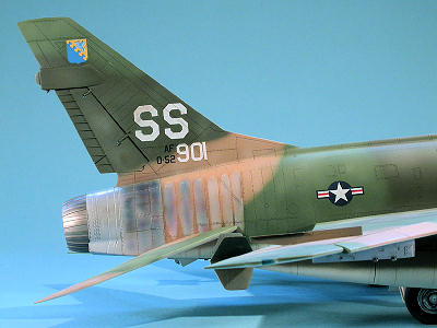F-100s were originally deployed to Southeast Asia in aluminum lacquer overall, and then painted in the field in the T.O. 1-1-4 camouflage pattern. These airplanes were well worn with a distinct burned appearance to the hot titanium sections on the rear of the fuselage. The paint flaked off because of the heat so much that the Air Force eventually just gave up and stopped trying to apply paint to this area. There also was great variation in the camouflage pattern, with no two aircraft being exactly alike. Additionally, the paint faded quite badly in the brutal tropical sun.
