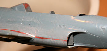 Once the glue was dry I dressed up the remaining seams. All lost panel lines were re-scribed with a needle chucked in a pin vise. The model was primed with an application of Krylon Brilliant Silver from a rattle can. Any seams that needed it were repaired. Once I was satisfied all the seams were smooth, my T-bird was ready for paint.