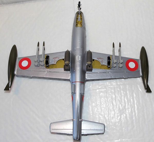 When dry the short HVAR rockets (some of them had been lengthened) were attached, one at a time. When dry some small distance pieces made from stretched sprue were glued on the attached HVAR rockets and painted silver when dry. After that the long HVAR rockets were glued in place one at a time and when done the model was finished.