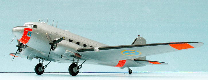 The Douglas DC-3 is probably the best known of all transport aircraft in the history. It was developed from the DC-2 transport, and flew for the first time late in 1935. The reason for developing the DC-3 was that American Airlines wanted an aircraft with better sleeping facilities for their “night sleeper” services. The aircraft was known as the DST, meaning Douglas Sleeper Transport accommodating 14 sleeping berths + a honeymoon suite behind the cockpit. Compared to the DC-2 the DST was 3 inches deeper and 26 inches wider, length almost three feet longer and span was increased by 10 feet. The take- off weight was increased from 18.000 lbs. to 24.000 lbs. and the engines each got an extra 180 hp.