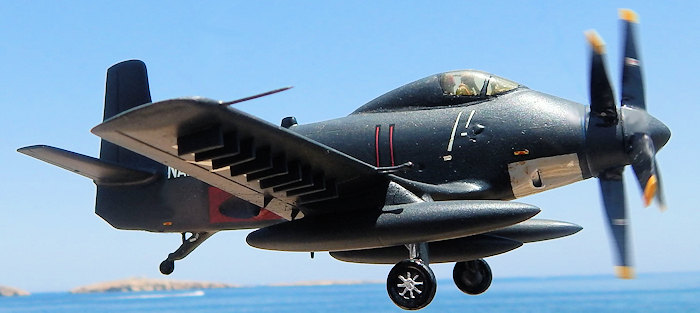 The Rareplanes scale model is that of Douglas A2D-1 Skyshark (Bu Aer 125480). This was the first production-style aircraft to fly with Douglas test pilot George Jensen at the controls on 10 June 1954. He ejected from a flight on 5 August 1954 because of gearbox failure which caused the aircraft to crash. The production A2D-1 had slight differences from the more well known XA2D-1, with a rounded cockpit canopy, redesigned armament racks and jet afflux.