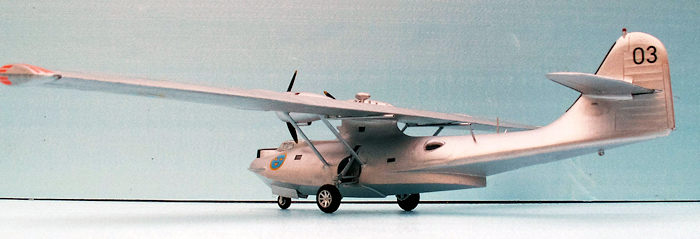 I started to assemble the kit in 1970. It was my intention to do a Danish PBY-5A with gear up and floats down and place the model in a nylon wire under the ceiling. However, for some reason I did not finish the project. The fuselage was completely assembled with tail plane and closed nose wheel doors glued in place. The wing was also assembled, and likewise the cowlings with engines and propellers.