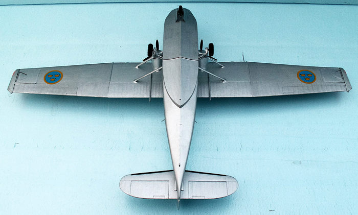 The three crowns markings on the wings (1800 mm actual size) and on the fuselage beneath the cockpit (1320 mm actual size) give the plane its military identity. I find the Swedish markings very attractive from an aesthetic point of view – probably the reason for my preference for modeling Swedish military aircraft.