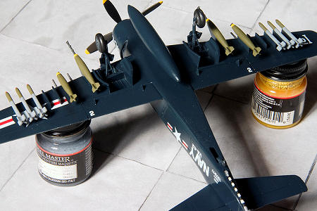 The fuel tanks are completely wrong, so they went to the spares box, and a single tank came from the Hasegawa kit. Armament came from the Hasegawa Weapons set and from the spares box. I think the rockets came with the Matchbox Panther and aren’t correct in shape, but I wasn’t going to “waste” more Hasegawa armament on this kit.