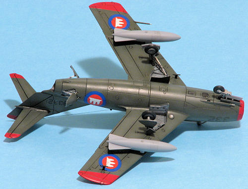 Based on my reference, I used the larger drop tanks. Here I encountered another problem. The kit includes separate parts for the forward V-shaped mounting struts, but these tanks should have a third strut located behind the forward pair. I added this from scrap plastic, though I’m not convinced I got the nose-down angle of the tanks quite right.
