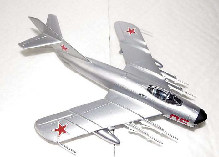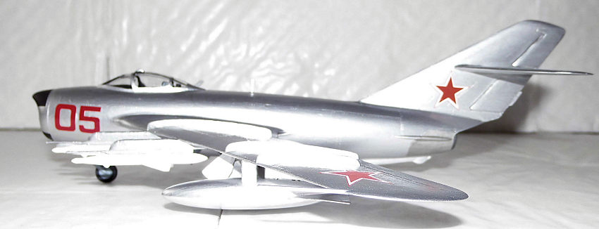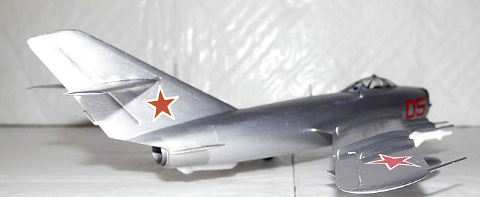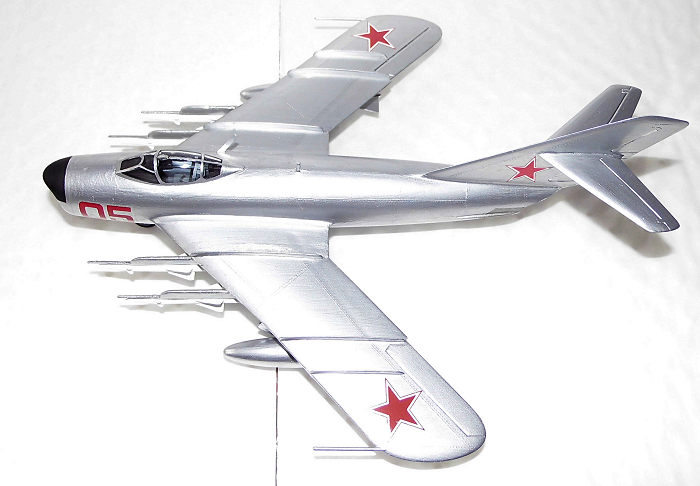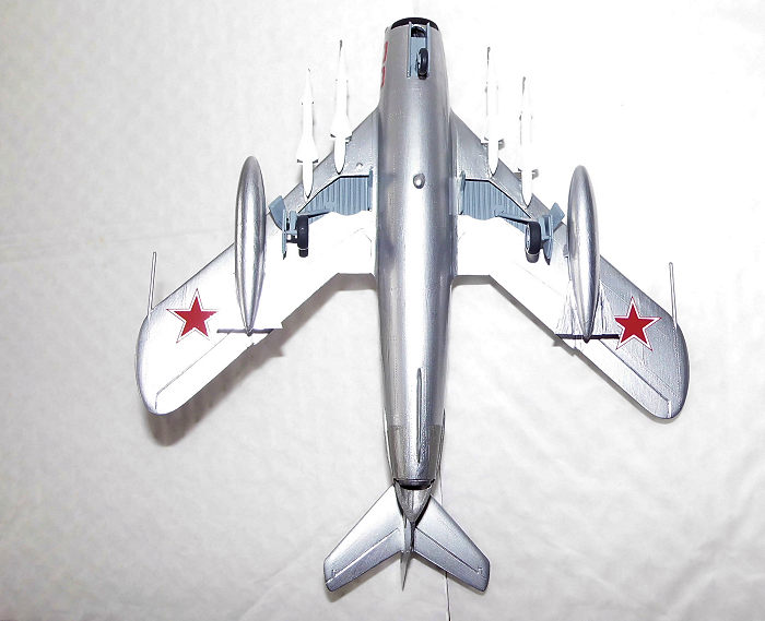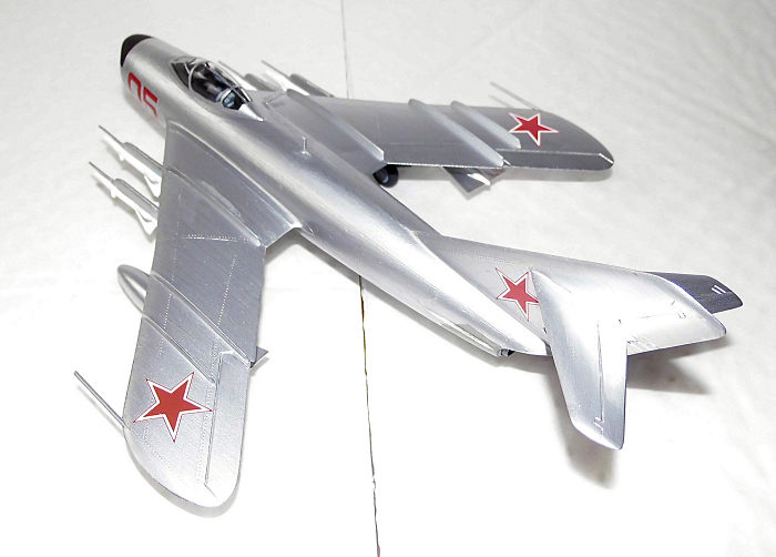 After having studied several pictures of natural metal MiG-17s, I decided only to use the red “05” from the kit sheet and discard the stars. There were two reasons for this; first, they didn’t seem to be quite of the right size and second, they lacked the thin red outline that I had noticed on the pictures, I’d studied. I had, fortunately, some assorted sheets of Soviet stars from CAM Decals where I found some appropriate replacements. As these are printed in two pieces to avoid register issues, I applied all the bottom pieces first, then the “05” on the nose and after some drying time, I applied the red stars themselves. I then cleaned and attached the missile pylons; they came from another kit I was constructing at the same time, namely a MiG-19 from Bilek. The Hasegawa ones are jokes, as are the missiles, so they were also taken from the Bilek MiG-19 kit. The pylons were painted silver (plus a few touch ups on the airframe!) and the missiles flat white (several coats needed!). When dry the decals were coated with clear gloss as all the touch ups also got! The last action was to glue the gear doors in place and the missiles to the pylons, and my Hasegawa Fresco was finished.