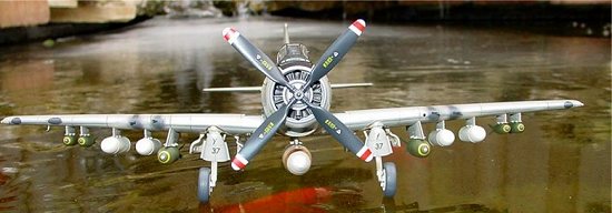 The oil spill on the fuel tank was created by allowing repeated flows of moderately thinned burnt umber followed by repeated flows of heavily thinned drops of the same until the effect pleased me, wiping off any excess from the lower surface of the tank in the direction of what the air flow would be. I used a fairly small brush and a capillary pipette as an applicator. In all, I had great fun with this one and I am ready to start another VNAF Skyraider, A-1J this time, in SEA camouflage.