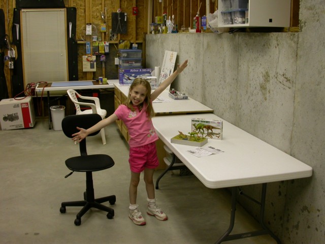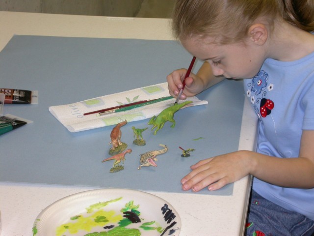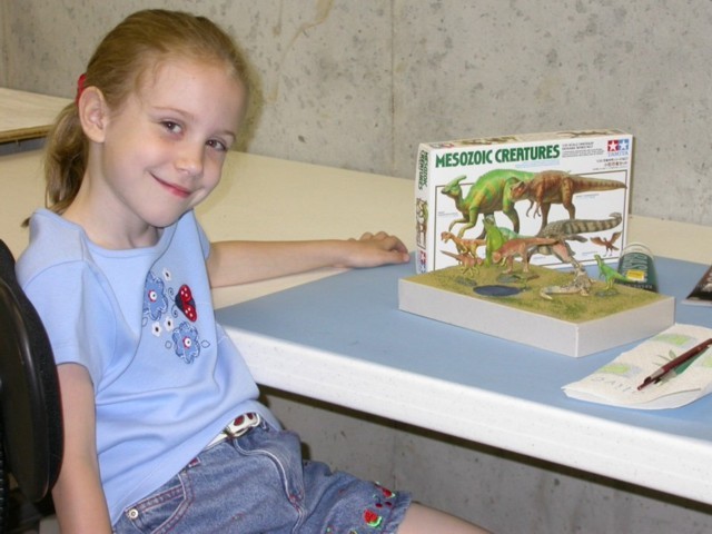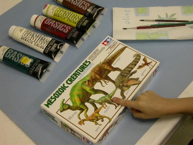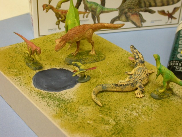 Building the dinosaurs was fun. After the paint dried, I talked Daddy into gluing some of his model grass on the bottom of the box. This makes it look ‘realer.’