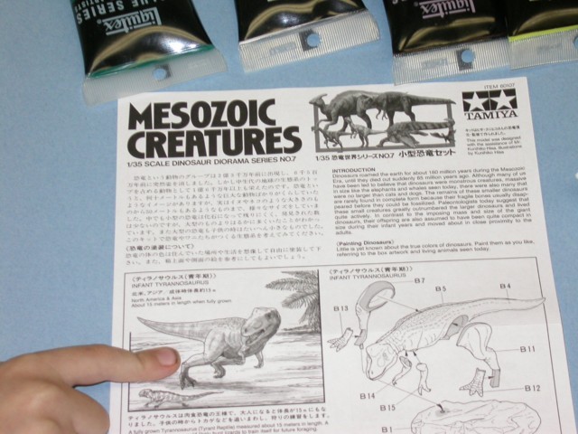 The kit was neat. It had 6 dinosaurs. First you read the instructions. The parts are named things like B-4 or A-5. First you read the instructions, ~ then you find the part!