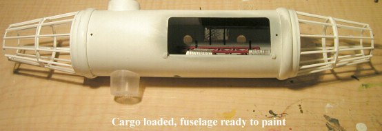 I next glued the bulkheads into place at either end of the fuselage, making sure that the slots for the cages were in the correct position. I cemented the front and rear cage halves together and mounted them to the ends of the Taxi, then glued a cylindrical plastic bottle cap from my spares box beneath the pilot's compartment to represent a semi-realistic airlock and hatch. I finished preparations for painting by using white glue to attach the top piece of the pilot's compartment directly to the opening and to seal the now-closed cargo door.