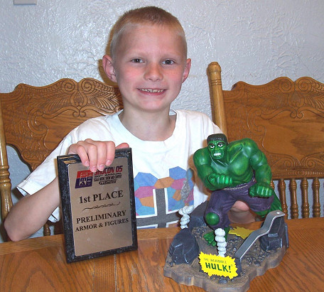 Well for the first little while he slept with the plaque and now it is proudly placed on the wall of our living room. He can’t wait to enter a model in the next contest but somehow I don’t think that his Glossy blue and red Mitsubishi A6M2 Type 21 Zero has the same chances his Hulk did. But it will get entered.