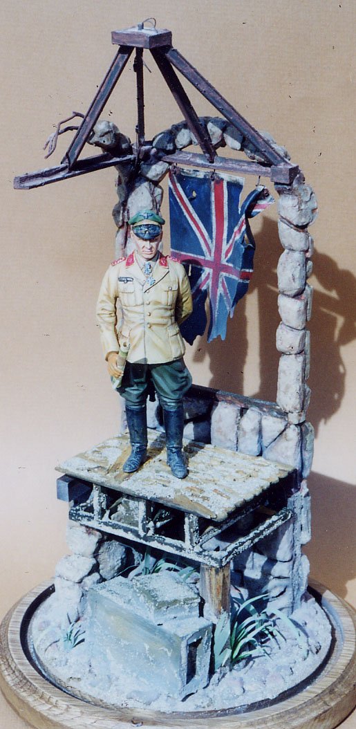 Part II will show the finished figure on the finished base. Pictures will show that I added a burned and tattered British Union Jack hanging from the arch behind Rommel for added color ‹ to compliment the red in his rank emblems and to give added symbolism without creating a scene/diorama. I will also explain how the flag was created.