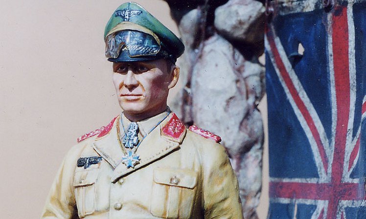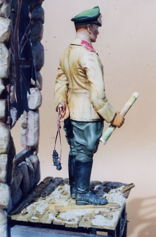 and I met for the first time at the KC-Con contest in Overland Park (a Kansas City suburb) on 23 March of this year, we had a good exchange about painting figures. Susan Powers, another entrant and fine figure painter from New Baden, Illinois area was also talking with us at the time. It was there that I volunteered to write a review of my just completed figure of the famous Feldmarschall for MM ‹ I had the figure entered in the KC-Con competition that day. So here I am with the review, trying to keep my promise. My word is my bond, you might say.Well, I feel that Rommel is very well known to readers of MM so I will not comment further. For the first time Military Enthusiast, I suggest the Internet as there must be many volumes about and photos of the WWII German hero ‹ who's life came to a tragic end!