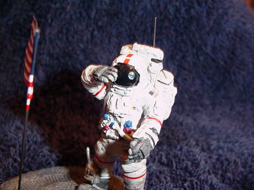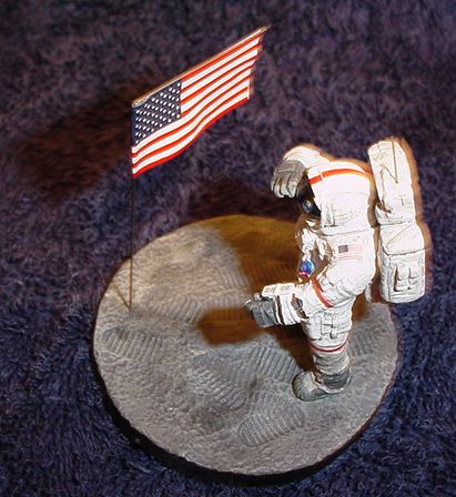 The flag pole had a horizontal stiffener bar, which I added using a small piece of metal stock from my spares box, and the flag was attached with no difficulties. Once the pole and the astronaut were super glued into place on the base, I used a light coat of black pastel to show the lunar dust adhering to the suit. The geologist’s hammer, and emergency air lanyards were then added, and the mission was complete!