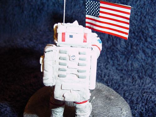 Assembly then continued with attaching the PLSS, and making sure the inlet and outlet hoses were properly in line. No problem there, as EVA Models has done a fantastic job with their parts breakdown! The saluting right arm was then attached. While the figure was drying, I painted the base in my home made “Moon Scheme”, of Gunship Gray, and then lightening it with varying shades of Gunze Sea Gray. Once painted, a hole was drilled in the base for the flagpole.