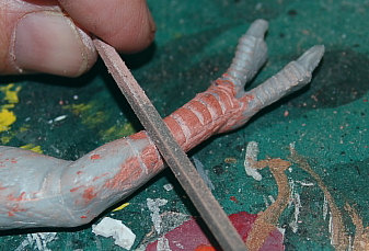 The Forearms Revisited: Now, it was time to get the angle of the arms just right so the Albertosaurus would have a good runner’s gait. This was accomplished by racing around the house in different styles , trying to figure out which would be the most applicable. After terrifying the cat and our neighbors, a reasonable assumption was reached as to just how the arm movement would work with the lower leg pose. That, and I was out of breath. Glue them on with gap filling super glue, and putty.