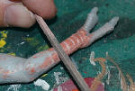 The Body: So, the puttying is all finished right up. Whooohoo! Now, break out a carving bit for your moto-tool, and start matching up the skin lines. Putty, Sand, Repeat. This is the dogma that we live by. PSR until everything looks kosher, the folds all match up, and there are no more corrective scars than you can see on Dr. 90210.