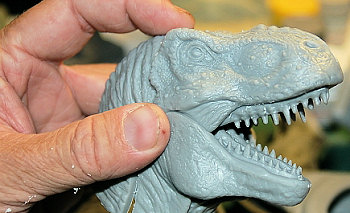 As was so wisely pointed out to me by a MM reader’s child “make sure the teeth aren’t too white, ‘cause T-Rex didn’t use a toothbrush”*. The teeth were painted Testor’s “desert sand”, and then capped with a light mixture of white. Several coats of pure Future were applied to give the assembly a “wet look”.