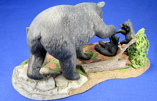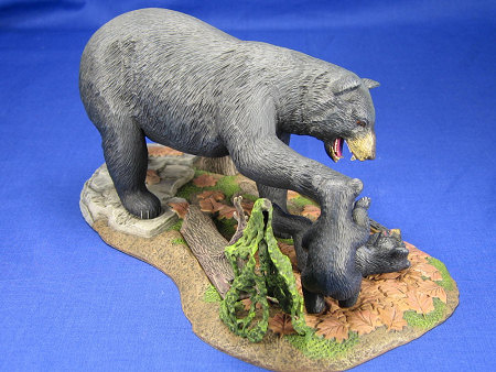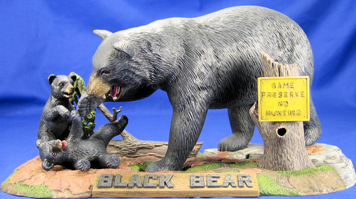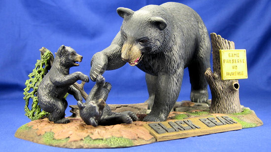 Aurora’s “Black Bear and Cubs” kit depicts a mother black bear playfully pawing at her two cubs on a woodsy, scenic base. It consists of parts to make the mother bear and cubs, as well as a base, parts for a stump, a “No Hunting” sign, and a broken tree branch. All of the parts are molded in black plastic.