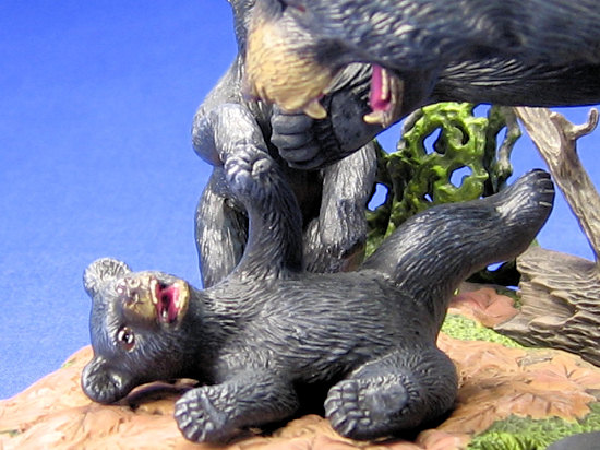 One of the focal points of any animal, monster or dinosaur is always the eyes. I painted the bears’ eyes Testors Acrylic Leather with Panzer Gray pupils. I placed a very small dot of black in the center of each pupil, and then a really tiny dot of white in the center of that. This method is recommended by Tamiya in all of their excellent dinosaur diorama kits (I hope to show some of those in the future) and I find it does really create very good looking eyes. To finish the bears I airbrushed a coat of Testors Semi-Gloss over all three of them in the hopes this would duplicate the sheen you see on the fur of real animals. The last step was to apply some Testors Gloss on to the eyes and mouths of each bear, and a little onto the nostrils of the mother bear. I get some bad hay fever in September – maybe she does too…
