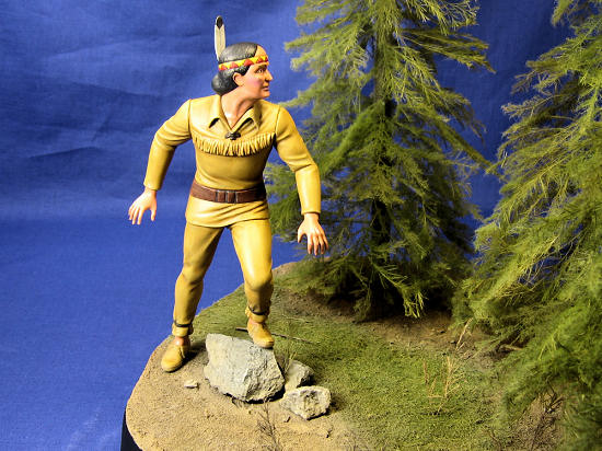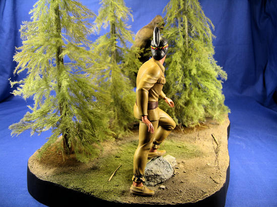 Painting faces are not my specialty, so I decided to keep it simple. I used Testors Warm Flesh tone as a base coat and applied it with a brush. Next I washed all of the flesh areas with a wash made of Testors Flesh Shadow and thinner. I used a little bit of Testors Light Flesh tone to highlight his nose, brow, and chin. I then put a couple of dabs of pink on his cheeks and lower lip, and blended them in with a #10/0 brush and thinner. Next I painted his eyes with a custom off-white shade; basically Testors White with some Sand mixed in. I used Raw Umber for his pupils and eyebrows. Finally I painted his hair Polly S Grimy Black and lightly drybrushed it with some Testors Panzer Gray. Some Testors Gloss was applied to his eyes, and the feather was glued to his head. The man was now ready for his encounter with the unknown!