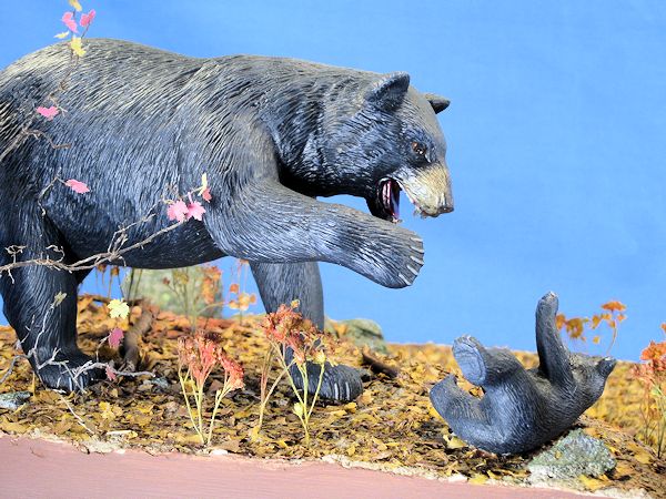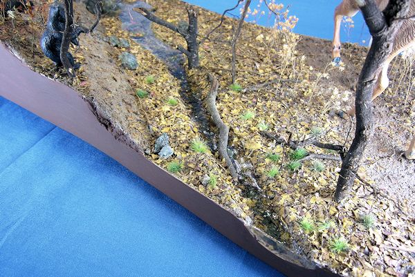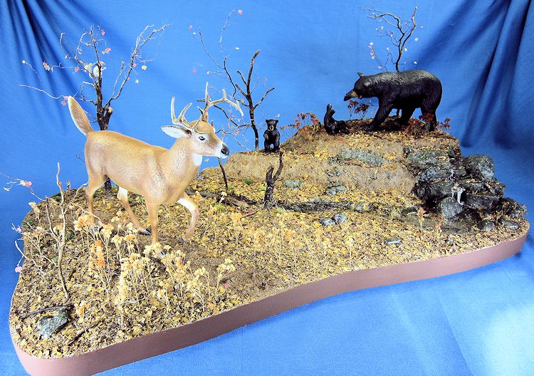 I painted the base’s edges with brown craft paint, and then glued the animals in place using Walthers Goo. My last step was to paint a small yellow triangle on the tree trunk near the trail to represent a trail marker. And with that the diorama was done.