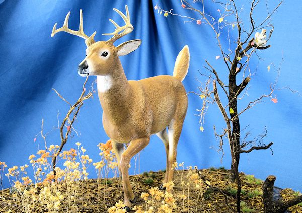 The hooves and nose were brush-painted Vallejo Black Gray, and then I brushed some MIG Productions P245 “Brown for Dark Green” filter over the whole model. This acted as a very light wash, adding some depth to the deer. Some subtle dry-brushing followed using Testors US Army/Marines Gulf Armor Sand to add some highlights to the deer. I then painted the eyes, first base-coating them with Vallejo Chocolate Brown, then adding eyeballs using Vallejo Black Gray and pupils with Testors Black. A tiny dot of white in each eye was followed by some Testors Gloss. The deer had an overall slightly glossy sheen which I left alone since animals’ fur seems to look either glossy or flat in different lighting conditions.