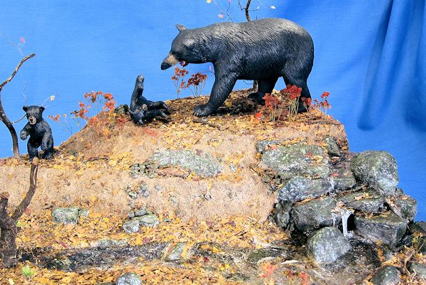 diorama, an elevated area for the bears, and a babbling brook with a small