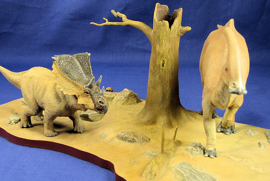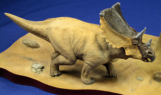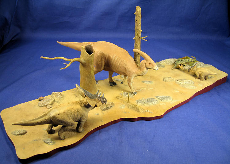 All three dinosaurs were given a wash of about 50:50 raw umber/raw sienna, applied over all surfaces with a ¾” wide brush. This was followed by lightly drybrushing them with lighter shades of their base colors. A pattern of Dark Gray and Dark Brown was painted on the faces of the Chasmosauruses to make them look a little more interesting, while some dark gray blotches were added to the Parasaurolophus’ armpits and feet. Both were drybrushed to add more depth. All of the toenails, horns, and beaks were painted Testors Panzer Gray and drybrushed with Testors Neutral Gray. Finally the eyes were painted Testors Leather with black pupils, and a coat of Testors Acrylic Gloss to provide some shine.