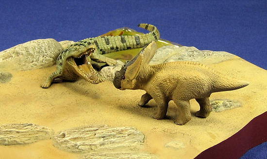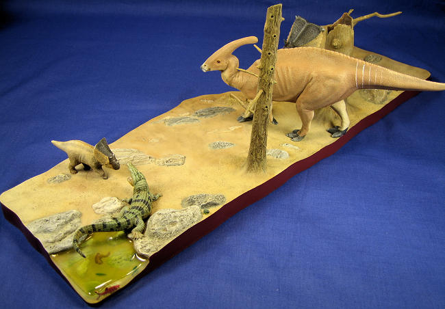 To add drama to the scene I decided to add the crocodile from Tamiya’s “Mesozoic Creatures” set; angry and defending his watery turf from the young Chasmosaurus. This of course isn’t pleasing its mother – nor is the fact that a big, thirsty Parasaurolophus has just ambled onto the scene.