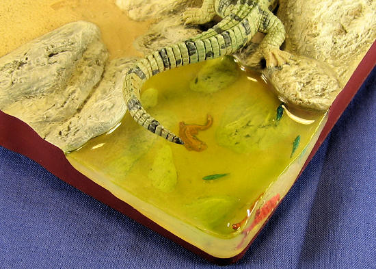 I wanted the crocodile to look like the real thing, so I painted its undersides Testors Wood and then airbrushed some Testors Acrylic RAF Interior Green on its upper surfaces. I brush-painted the black stripes, and then washed and drybrushed him per my normal procedure. His mouth was picked out in a beigey-pink that I mixed up, and his teeth were painted a light beige color. A dark wash added some nice grunginess to his mouth, and some gloss finished it off.