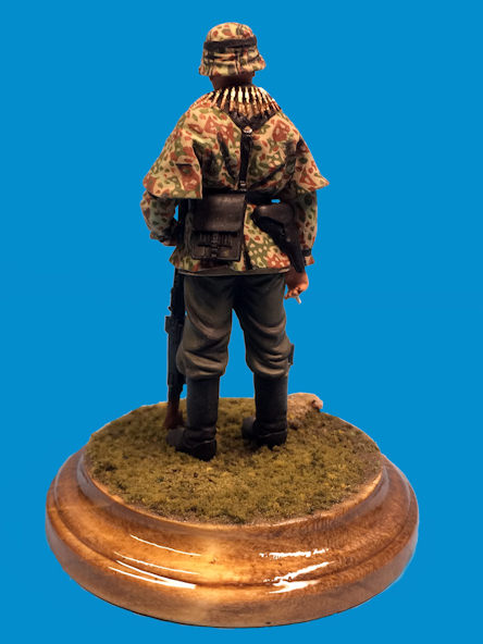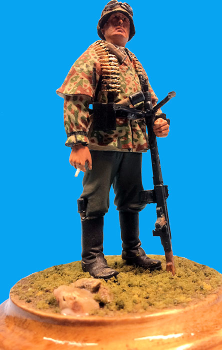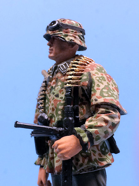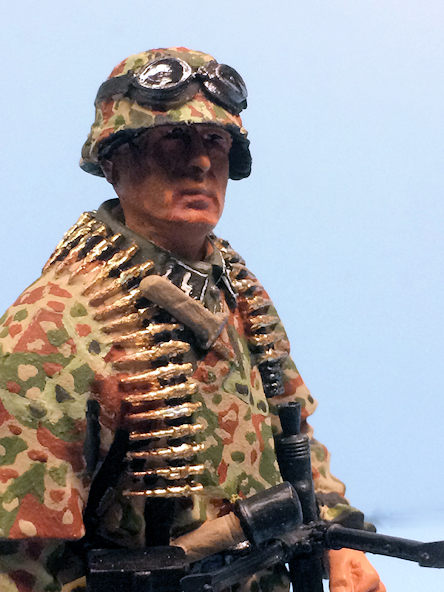 I spray painted the figure with a coat of Testors enamel flat white. As is my practice, I primarily used a variety of relatively inexpensive acrylic craft paints to apply (note: I find Testors enamel better for the metallic colors such as the gunmetal of the MG42 and the gold and brass cartridges).