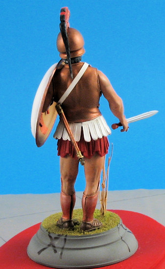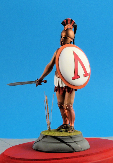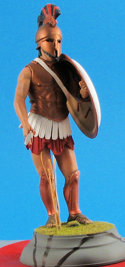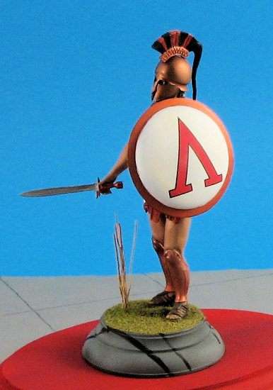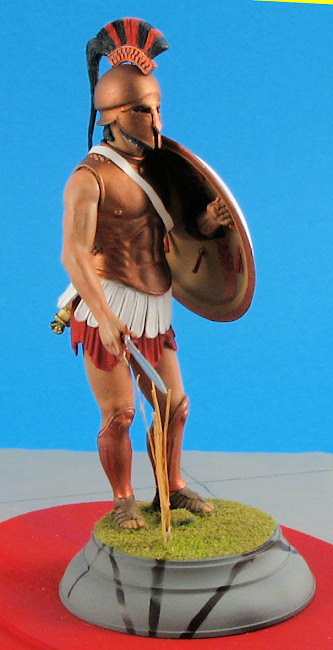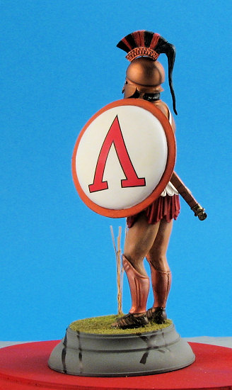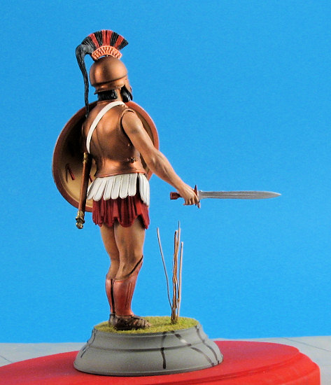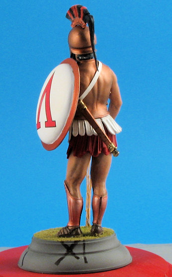With all of the flesh areas done to my satisfaction it was time to paint the rest of the figure. The helmet was airbrushed Humbrol Bronze metallic as was the cuirass. This paint did not need to be thinned and covered very well. The helmet crest is a separate piece. It was painted Liquitex Dark Blue acrylic using a hand brushing technique. After this paint had dried, a Pentel Bronze pen was used to paint the raised design on the crest. This made very short work of what could have been a tedious job. (The Pentel pen was also used to paint the greaves on the legs.) The crest itself was made of horsehair in real life. This was airbrushed with Aeromaster Mitsubishi Cowl Blue-Black acrylic, a color that unfortunately is no longer available. One can replicate the color though by mixing an equal part of your favorite brand of dark blue and black. After the paint had dried Humbrol Scarlet was used to paint the other color in the crest representing horsehair dyed in the Spartans’ “national” color.