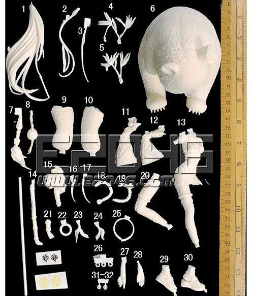 comprised of 31 parts in a light colored resin and 1 piece of plastic rod for